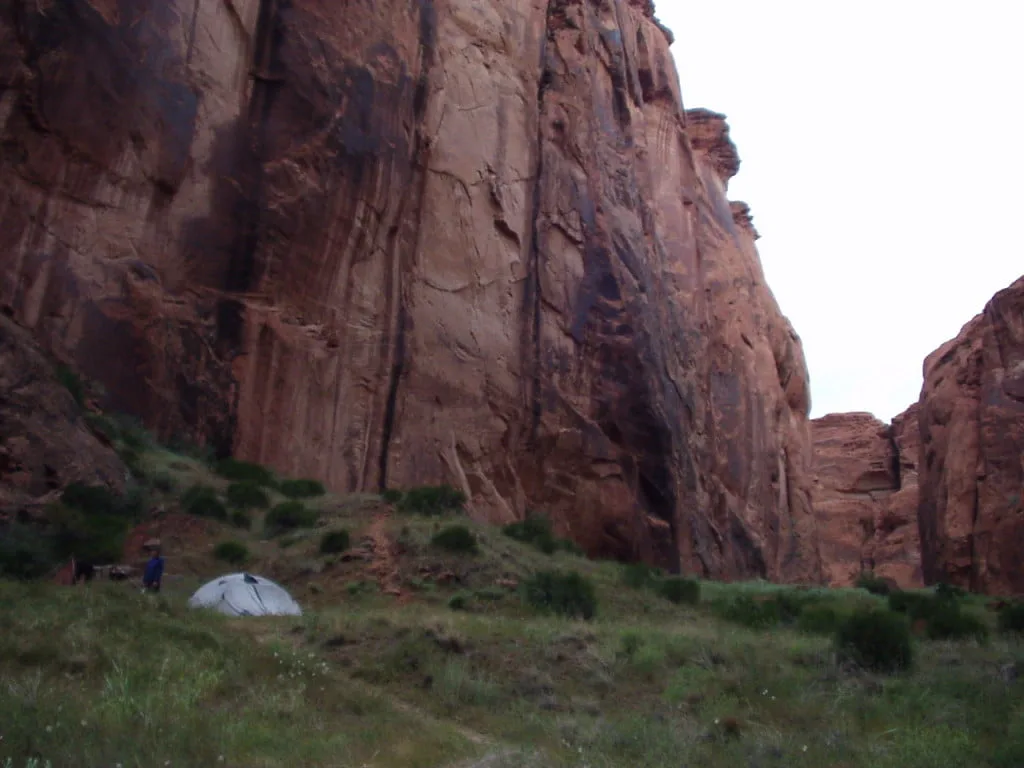 As our entry had been delayed at the ranger station due to temporary weather concerns, we arrived after nightfall in a light but steady rain. We had to wade through knee-high water in a pitch black canyon with headlamps, trying to find the small elevated area where we could safely camp for the night. It was scary at moments, not being able to see beyond the beams of our headlamps in the vast darkness, wondering what might be lurking around us. After we finally found the elevated camping area and set up our little backpacking tent, I cooked our freeze-dried dinner on an alcohol burner made out of a soda can, beneath a small tarp in the cool desert rains.