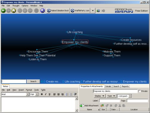 I currently use Personal Brain mind mapping software (see sample screenshot above) and find that it suits many of my needs. While I do not expressly endorse any specific program and cannot provide specific recommendations, I’ve also explored Freemind, MindManager and OpenMind to lesser extents. The software descriptions and manuals usually utilize terminology such as projects and goals rather than visions, because the designers also seek to attract a traditional business audience.